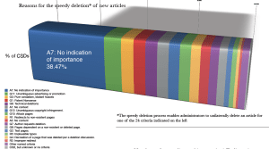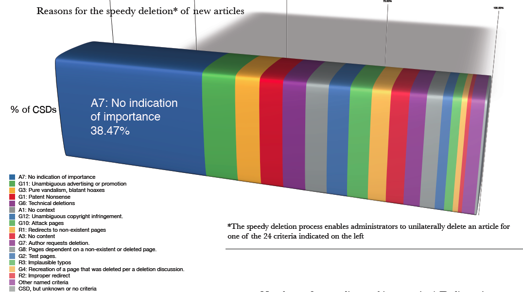 2. Surprisingly, spam, vandalism and patent nonsense make up only 8.00%, 5.69% and 5.36% of CSDs respectively, while the more subjective ‘No indication of importance’ makes up 38.47% of all CSD criteria.