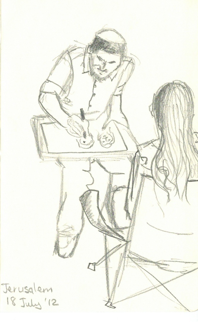I was sitting on a stone staircase in Jerusalem’s Mamilla Ave overlooking the street below. It was about 10pm but the street was really busy, with families and groups of young people hanging out and celebrating the summer night. I got out my new notebook and pencil when I saw this Hasidic artist guy drawing cartoons of three beautiful young European women. I was sitting behind him drawing him drawing them and I kept thinking what a wonderful moment it was for those girls – how they would think back to the time they got a street artist to capture them on a hot summer night in Jerusalem.